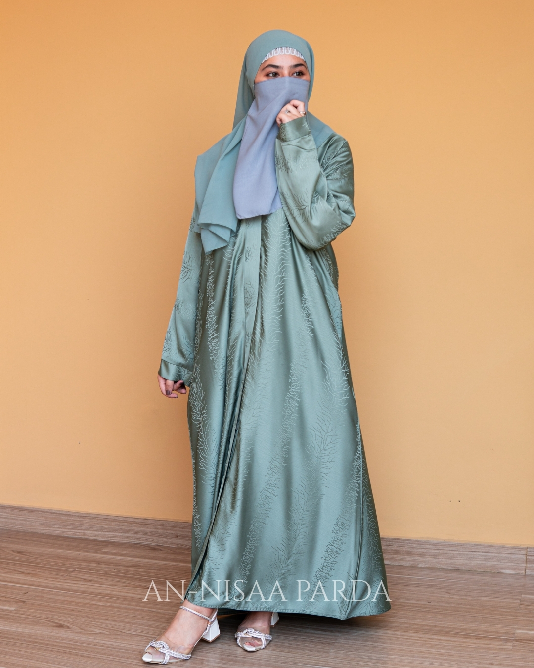 An open-front gown for formal wear, crafted from jacquard fabric.